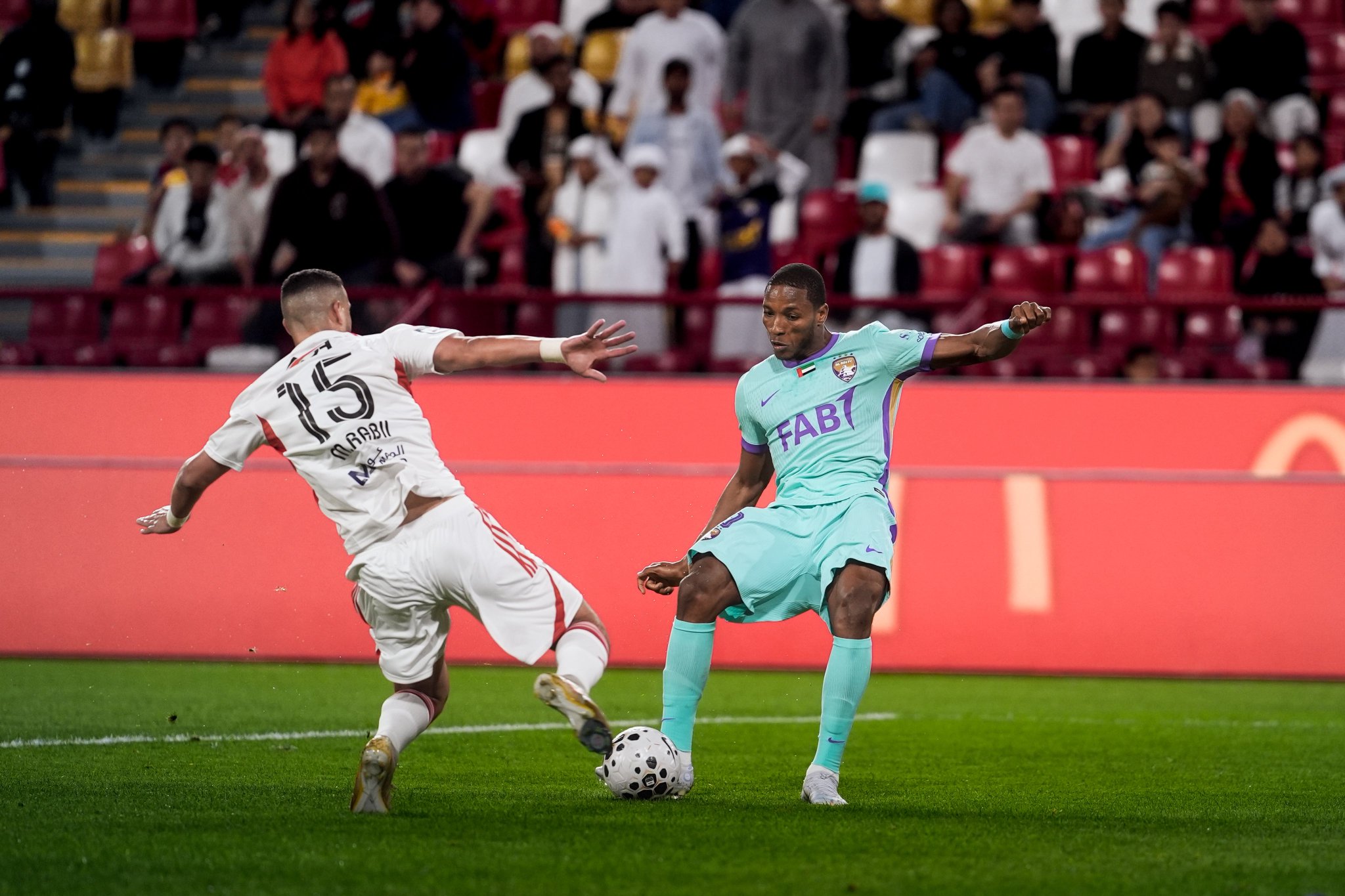 Al Ain Club maintained its pressure on the forward line of play during match’s second half, where they threatened Al Jazira Club’s net with several scoring attempts, the most prominent of which is a shot by Rahimi that went over the competing team’s bar. The match witnessed a noticeable surge in performance momentum, as both teams were looking for the advance goal amidst energetic atmospheres on the fans’ benches.